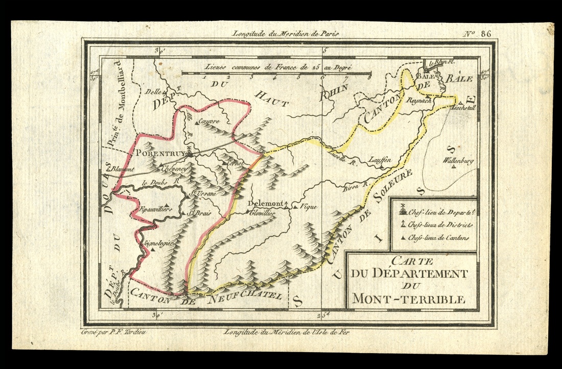 France. Lot of colored Maps from late 18th-19th Century editions: Northwest France, Northeast France, Southeast France with Corsica. 22 ½ x 17"; Two by Tardieu -- Carte du Département du Mont-Terrible. 7 ½ x 4 5/8"; and Département du Mont-Blanc. 5 5/8 x 7 ¾"; and 21 maps of various Départements, 7 ½ x 5 1/3". With 19 accompanying descriptive pages. [26 maps]