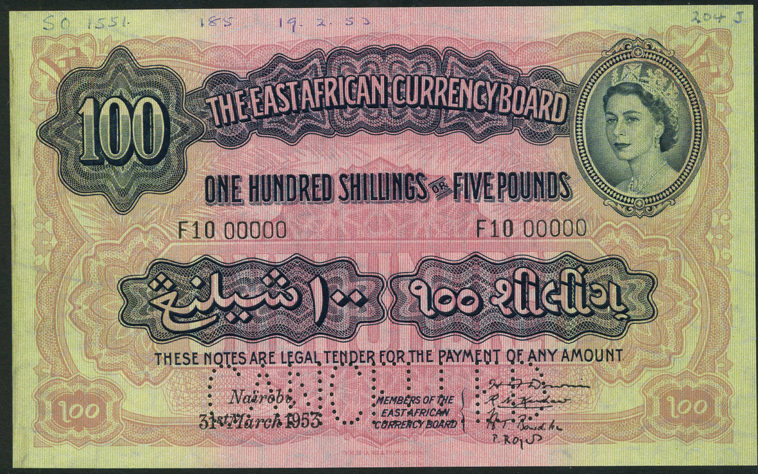 East African Currency Board, specimen 100 shillings, 31 March 1953, serial number F10 00000, pink and yellow-green, Elizabeth II at right four signatures low right