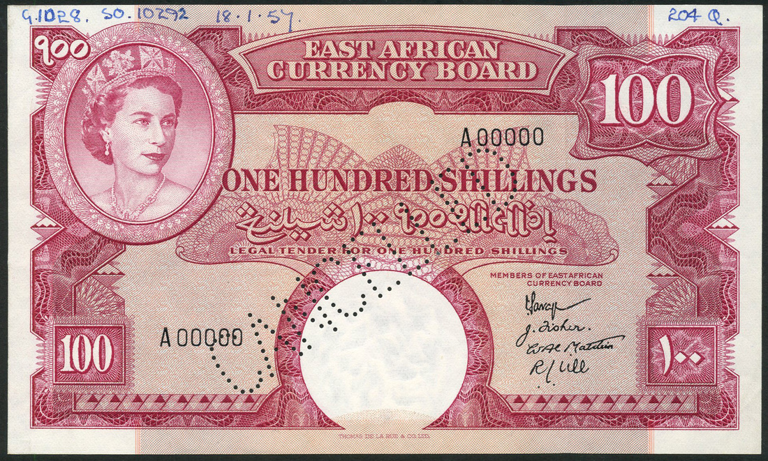 East African Currency Board, specimen 100 shillings, ND (ca 1957), serial number A 00000, pink-red, Elizabeth II top left, four signatures low right