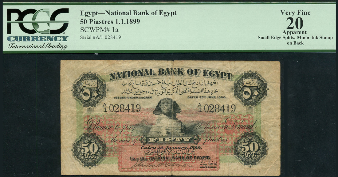 National Bank of Egypt, 50 piastres, 1 January 1899, serial number A/1 028419, black on red and green underprint, The Sphinx at centre, value at centre, and each corner, reverse green, value at left and right