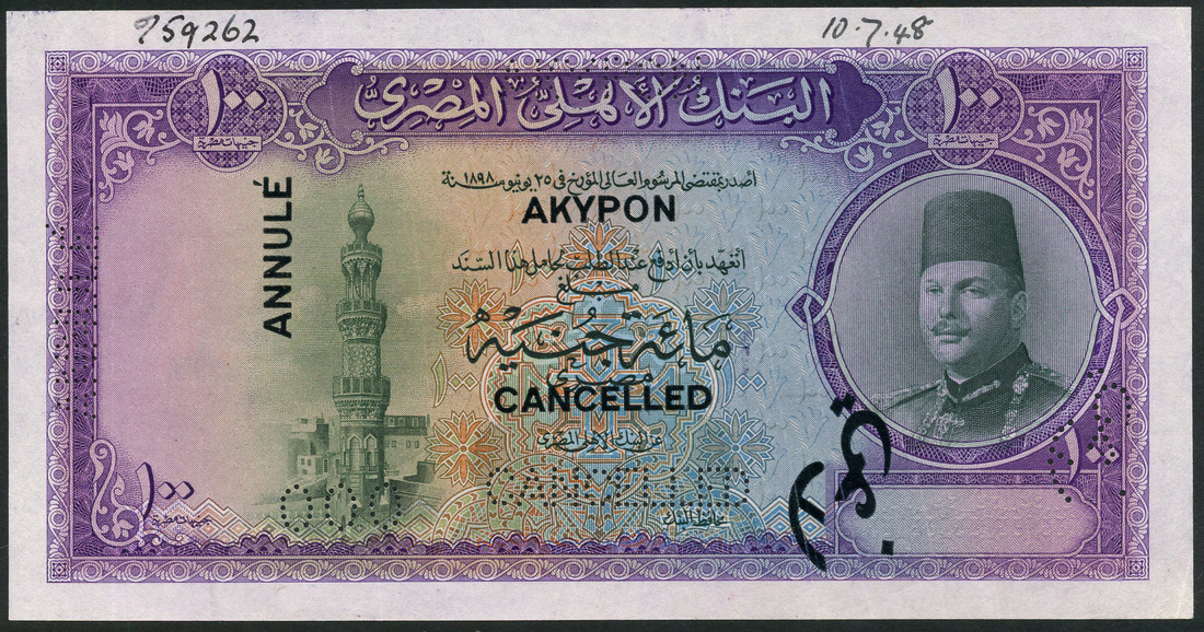 National Bank of Egypt, specimen £100, ND (1948-51), no serial number, purple on multicolour underprint, portrait King Farouk in circular frame at right, minaret at left, ornate border, reverse, mosque at centre