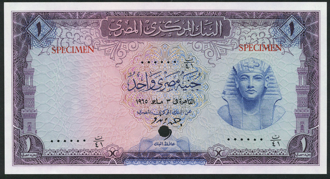 Central Bank of Egypt, colour trial 1 pound, 1965, zero serial numbers, violet and pale blue and pink, Tutankhamen at right