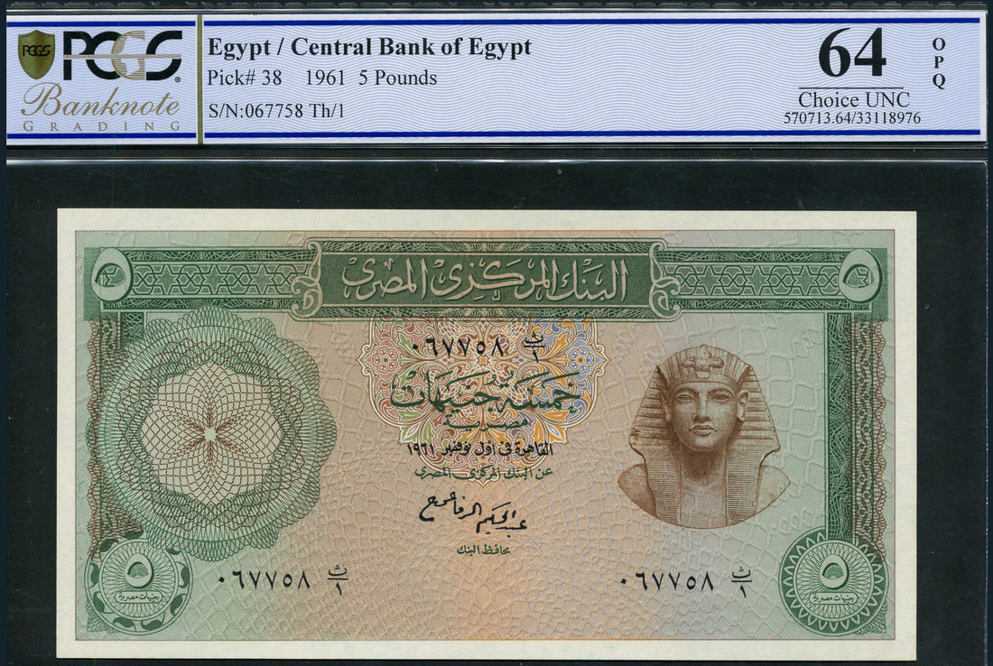 Central Bank of Egypt, $5, 1961, serial number 067758, green on multicolour underprint, mask of Tutankhamen at right, value in each corner, reverse, green, bank title top centre, value at left and right in ornate guilloche patterns