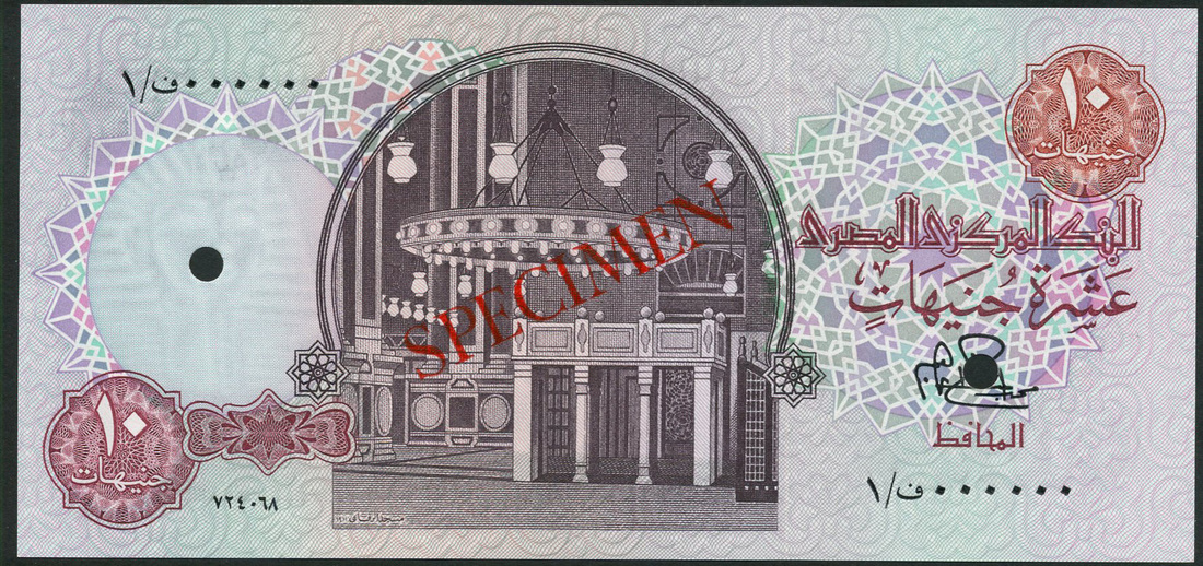 Central Bank of Egypt, specimen 1 pound, ND (1976), pink and brown, Sultan Qait Bey Mosque at left centre, Ibrahim signature, also specimen 10 pounds, ND (1976), mauve and pale blue, the Al-Rifai Mosque at centre, Ibrahim signature