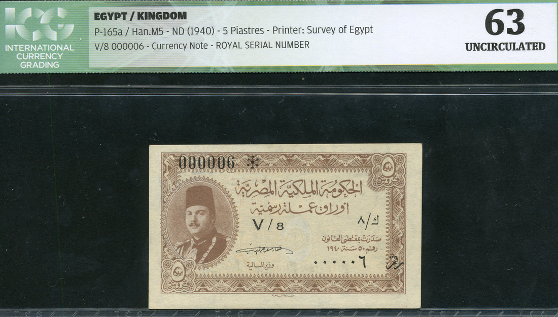 Egyptian Currency Note, 5 piastres, ND (1940), serial number V/8 000006, light brown, portrait King Farouk at left, value low left and top right, ornate border, reverse, light grey on pale blue underprint, bank title low centre flanked by value