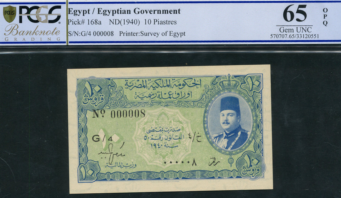Egyptian Currency Note, 10 piastres, ND (1940), serial n umber 000008, blue and light green, portrait King Farouk in circular frame at right, ornate border, reverse, green on light pink underprint, bank title in tablet at centre right