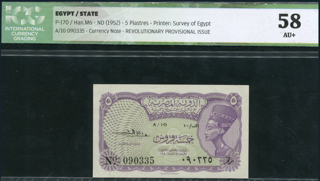 Egyptian Currency Note, 5 piastres, ND (1952), serial number A/10 090335, lilac on pale green underprint, portrait Queen Nefertiti at right, value top left and right, reverse, brown, bank title low centre flanked by value in ornate guilloche patterns