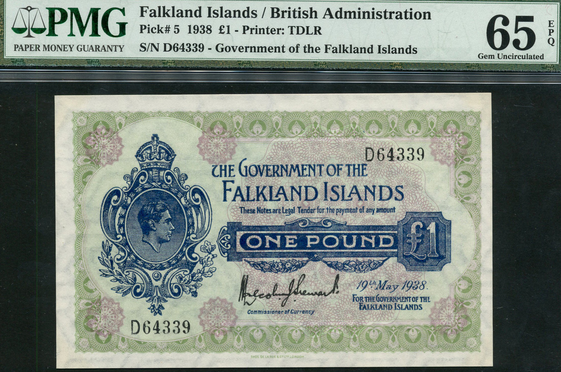 Government of the Falkland Islands, £1, 19 May 1938, serial number D64339, blue, green and pink, George VI at left, value at right and in blue tablet at centre
