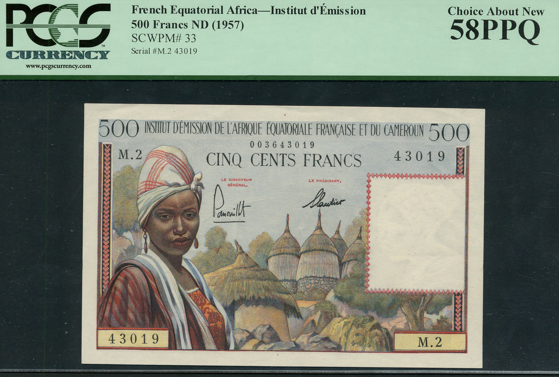 Institute d'Emission de l'Afrique Equatoriale Francaise et du Cameroun, 500 francs, ND (1957), serial number M.2 43019, multicoloured, woman at left, huts at centre, reverse, freight train crossing bridge at centre