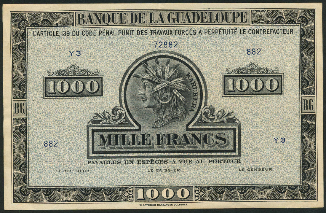 Banque de la Guadeloupe, 1000 francs, ND (1943), serial number Y3 882, black and pale blue, Karukera at centre flanked by value, bank title top centre, no signatures, reverse pink and orange, compass and value
