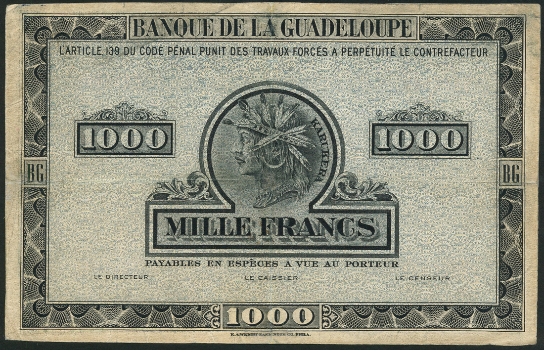 Banque de la Guadeloupe, 1000 francs, ND (1943), serial numbers omitted, black and pale blue, Karukera at centre flanked by value, bank title top centre, no signatures, reverse pink and orange, compass and value