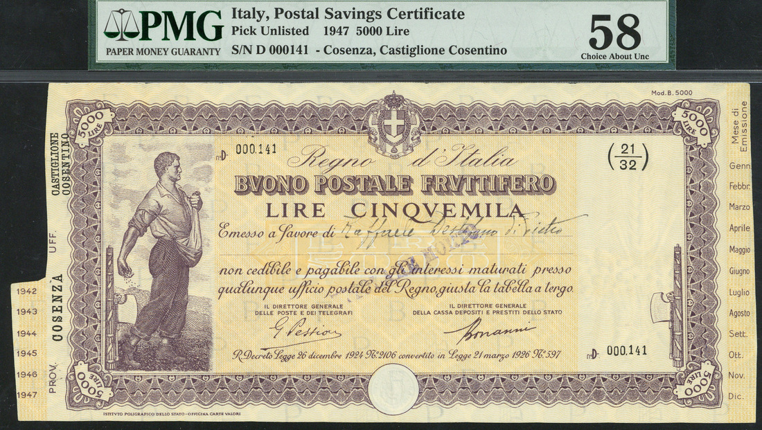 Postal Savings Certificate, Italy, 500 lire, 1000 lire and 5000 lire, all 1947, serial numbers 000331, 000388 and 000141, mauve on pale blue underprint, mauve on light pink underprint and mauve on pale orange underprint respectively, all feature farmer at left, arms top centre