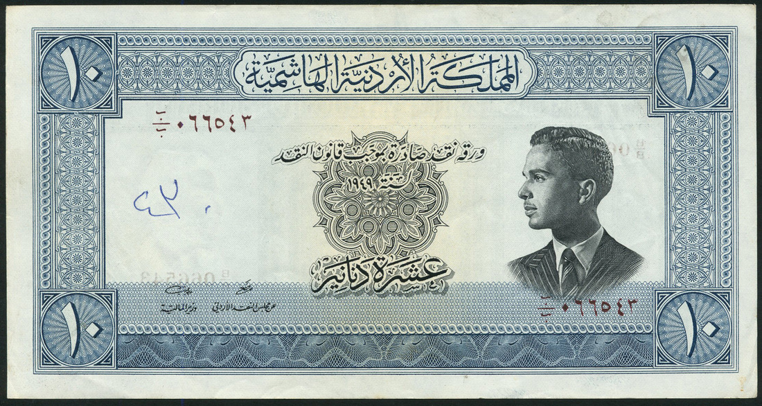 Hashemite Kingdom of Jordan, 10 dinars, ND (1952), serial number B/B 066543, dark blue and grey, portrait King Hussein at right, value in ornate tablets in each corner, reverse, rock-cut architecture of Al Khazneh (The Treasury) at Petra archaeological site