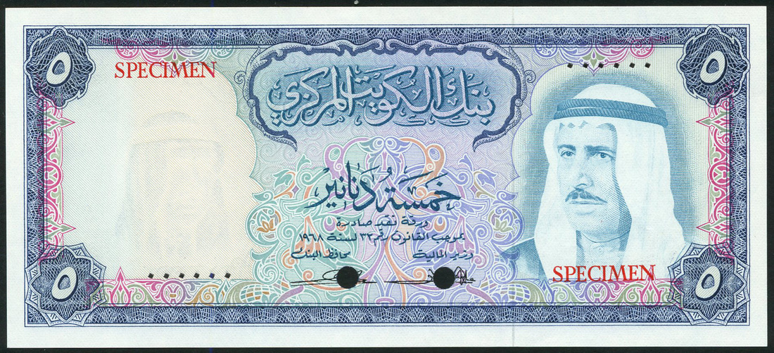 Central Bank of Kuwait, colour trial 5 dinars, ND (1970), zero serial numbers, blue and multicoloured, Sheikh Sabah Al-Salem Al-Sabah at right, Hamza Abba and Abdul Al-Rahman Al-Atiqi signatures, reverse blue, street view,