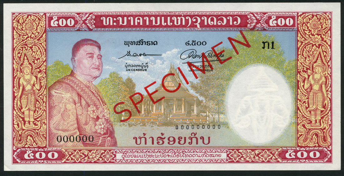 Banque Nationale du Laos, specimen 500 kip, ND (1957), serial number 000000, red and multicoloured, King S.Vong at left, temple at centre, reverse mauve and pale blue, buildings