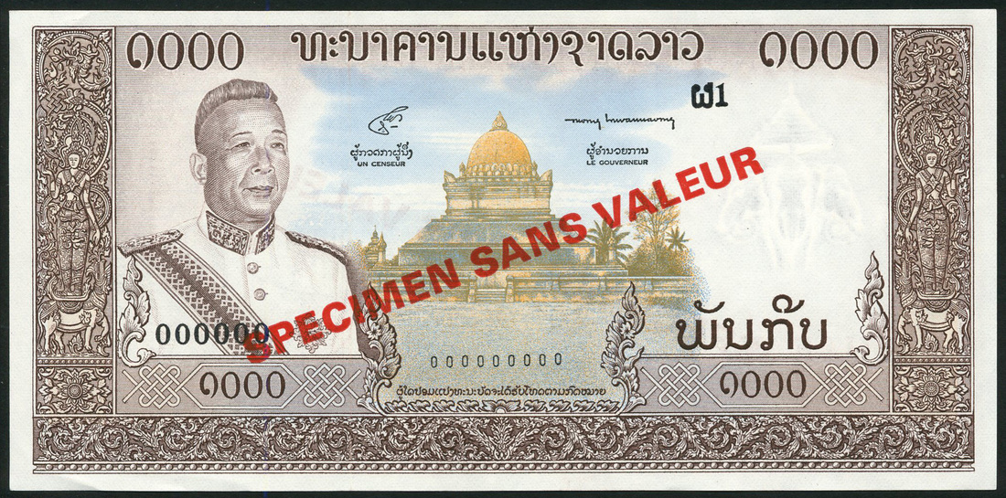 Banque Nationale du Laos, specimen 200 kip, ND (1963), zero serial numbers, blue and multicoloured, also specimen 1000 kip, ND (1963), zero serial numbers, brown and pale pink, both Savang Vatthana at left, temple at centre