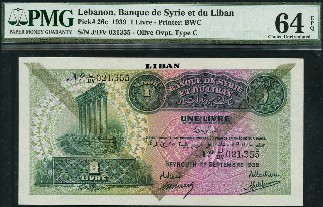 Banque de Syrie et du Liban, Lebanon, 1 livre, 1 September 1939, serial number J/DV 021,355, green on multicolour underprint, columns of Baalbeck at centre left, bank title flanked by value top centre right, reverse, red on light green and olive underprint, aerial city view at centre, type C overprint