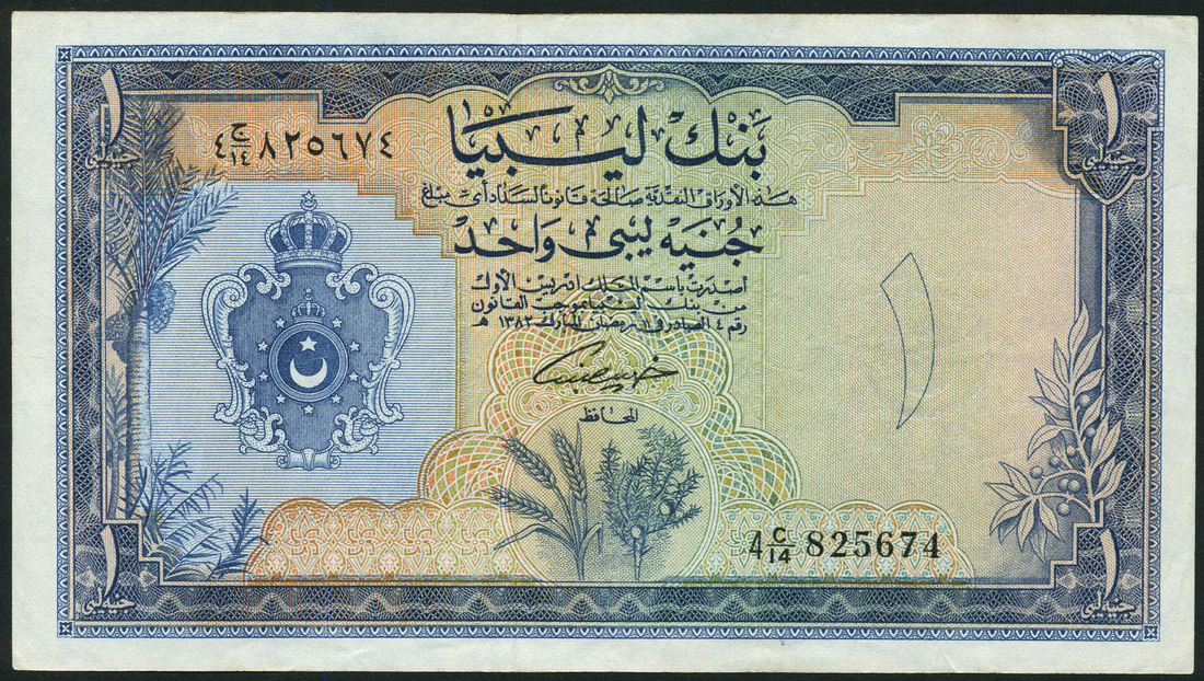 Bank of Libya, £1, ND (1963), serial number 4C/14 825674, dark blue on multicolour underprint, arms at left, wheat and jolbann plant low centre, palm tree at far left and olive branch at low right, reverse, dark blue on light orange and green underprint, bank title top centre, value in each corner and low centre
