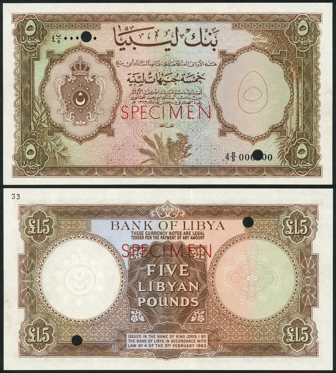 Bank of Libya, colour trial 5 pounds, 5 February 1963, zero serial numbers, brown and multicoloured, arms at left, value at right, wheat and jolbann plant low centre, reverse brown, value
