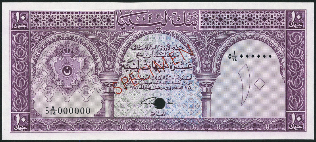 Bank of Libya, a specimen colour trial set of the 1963 series comprising 1/4 pound, blue-grey, 1/2 pound, red, 1 pound, green, 5 pounds, blue and 10 pounds, purple, all are arms at left and value at right, all signature of Khalil Al Bennani