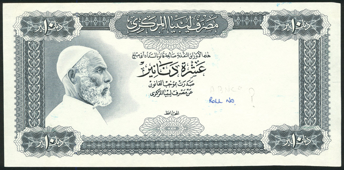 Central Bank of Libya, an obverse die proof 10 dinars, 1971, blue-grey and white, Omar El Mukhtar at left, reverse turquoise and white, fortress