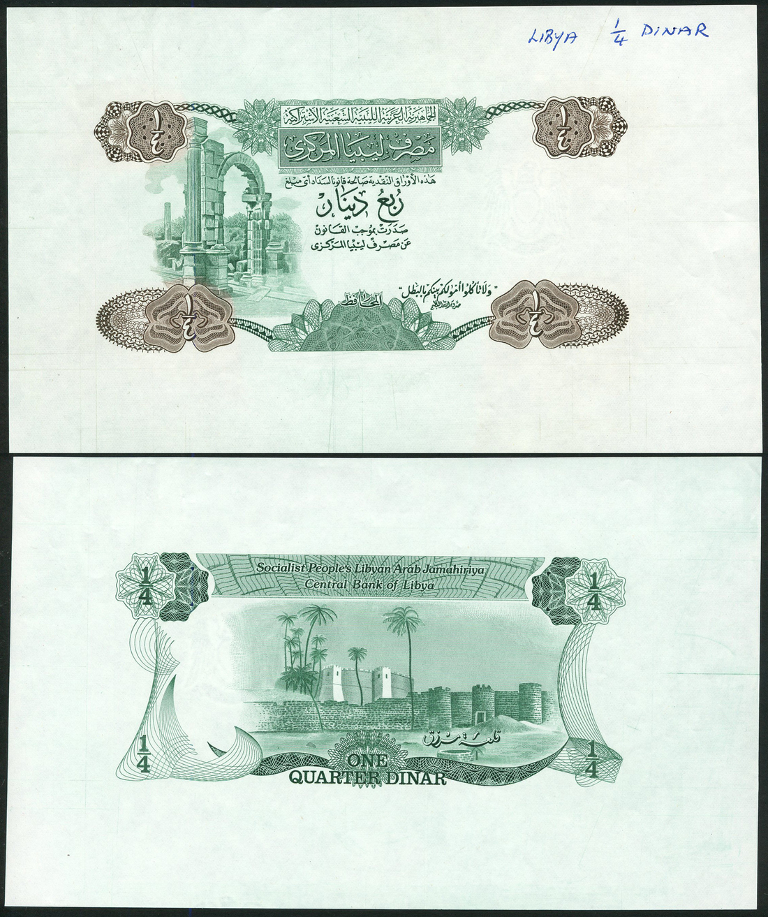 Central Bank of Libya, an obverse and reverse die proof for the issue of 1980 1/4 dinar, brown and green, the Arch of Trajan at left, reverse green, fortress