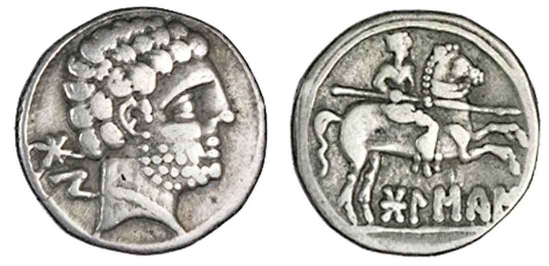 Spain. Bolskan. AR Denarius, ca. 150-100 BC. 3.95 gms. Bearded male head right, wearing necklace, rev. Horseman charging right, spear lowered, Iberian bolskan below. SNG BM Spain 710ff, CNH 2. About Very Fine.