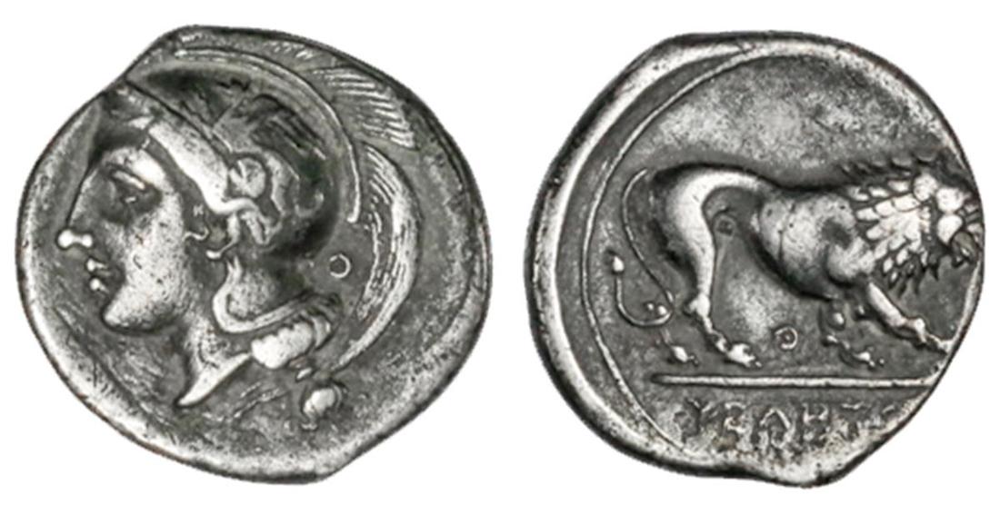 Lucania. Velia. AR Didrachm, ca. 300-280 BC. 7.36 gms. Athena head left Attic helmet adorned with a griffin, ? behind, rev. Lion walking right in slight crouch, ? below, YE?HT(?N) in ex. Cf. SNG ANS 1303 (head right). Slight porosity lower edge. Deep gray. Very Fine.