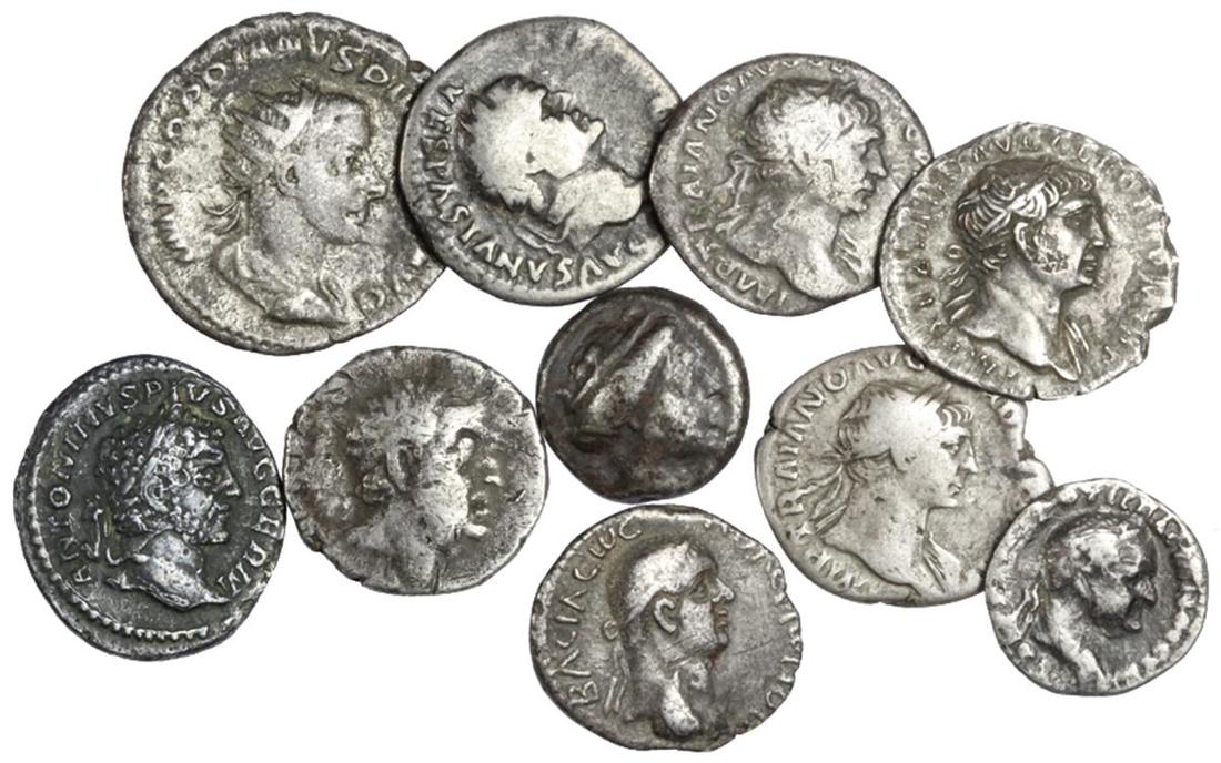 Greek and Roman Silver lot. Includes Kings of Pontus. Polemo II with Nero (38-64). AR Drachm. RPC I 3831. Rare. Porosity and irregular edge. Very Fine; a Kings of Cappadocia Drachm; uncertain AR. Female head r./Facing eagle; Quinarius of Vespasian; Denarii of Vespasian and Trajan (3); Antoninianus of Gordian III; and a contemporary counterfeit Denarius of Commodus. About VG-Fine. (10)