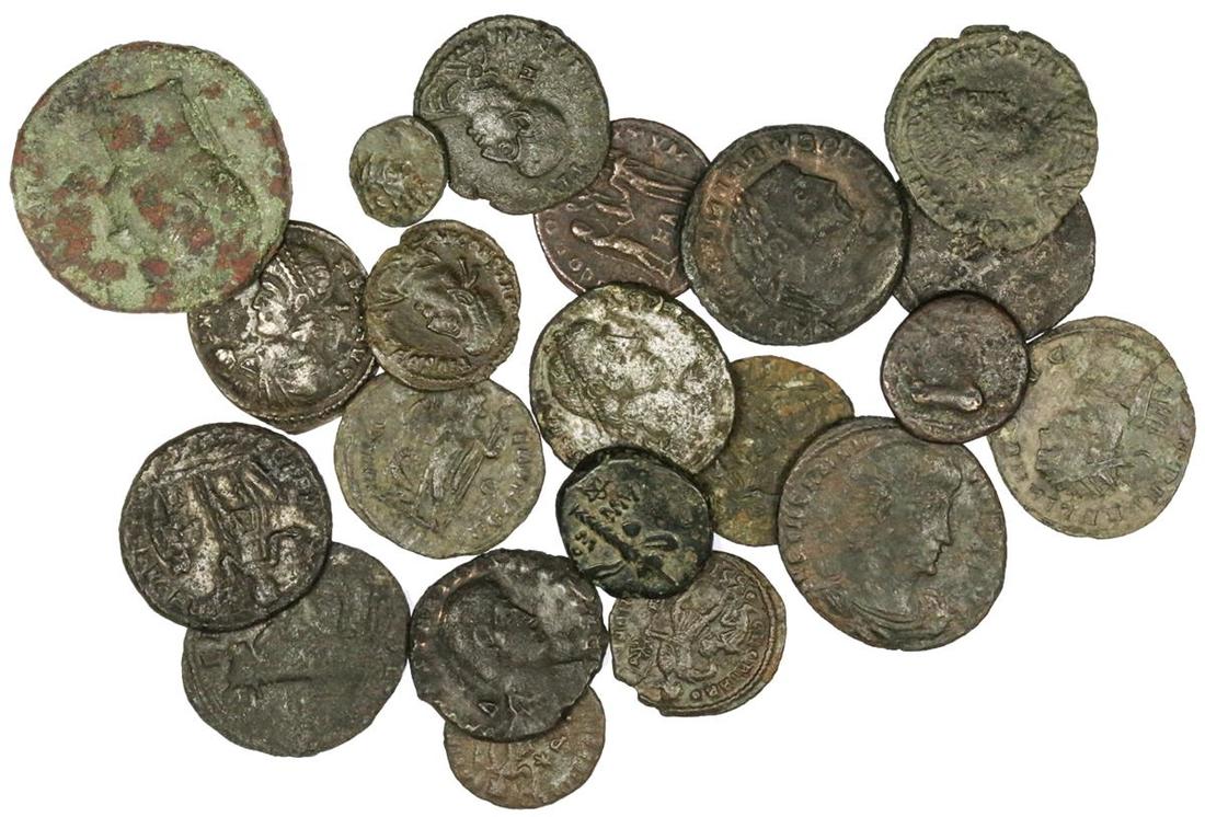 Small lot of Roman AEs (19). Nearly all Third-Fourth Century; also three Greek AEs. One with verdigris, some with rough surfaces. Fine-Very Fine. (22)