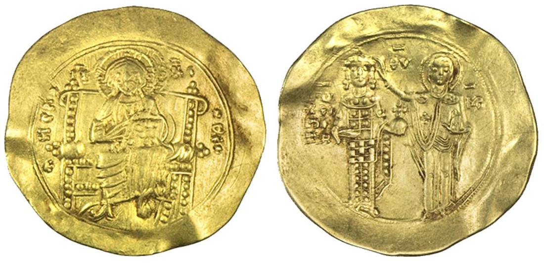Byzantine Empire. John II Comnenus (1118-1143). AV Hyperpyron, 1137-1143. Constantinople. 4.25 gms. +KE RO-H?EI, Christ Pantokrator facing enthroned, rev. I?/?EC/?O/TH, John standing, wearing loros and holding globus cruciger, being blessed by Theotokos. DOC 3a, SB 1940. Flan slightly wavy, thin test "X" in margin. About Extremely Fine.