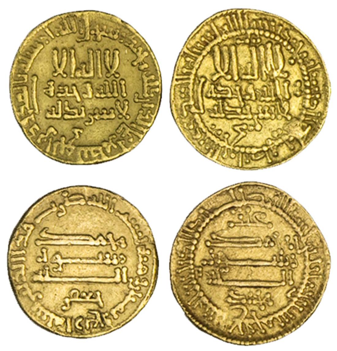 Abbasid Caliphate. Harun al-Rashid (AH 170-193/786-809 AD). Gold Dinar, AH 184. Egyptian issue. Citing Ja`far. A-218.11. Slight bend. Very Fine; also Aghlabid. Muhammad II (AH 250-261/864-874 AD). Gold Dinar, AH 257. A-446. Very Fine. (2)