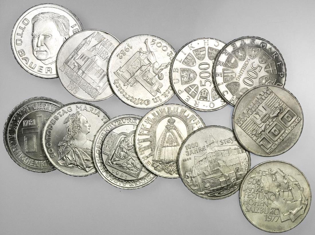 Austria. Republik. Modern Commemorative Silver Crowns: 500 Schilling: 1980 - Steyr, Maria Theresa, Austrian Red Cross; 1981 - Verdun Altar, Wildgans, Otto Bauer, Religious Tolerance; 1982 - Austrian Printing, Mariazell; and 100 Schilling: 1975 - 50th Anniversary Schilling, 1977 - Hohensalzburg, 1979 - Wiener Neustadt. Uncirculated-Brilliant Uncirculated. (12)