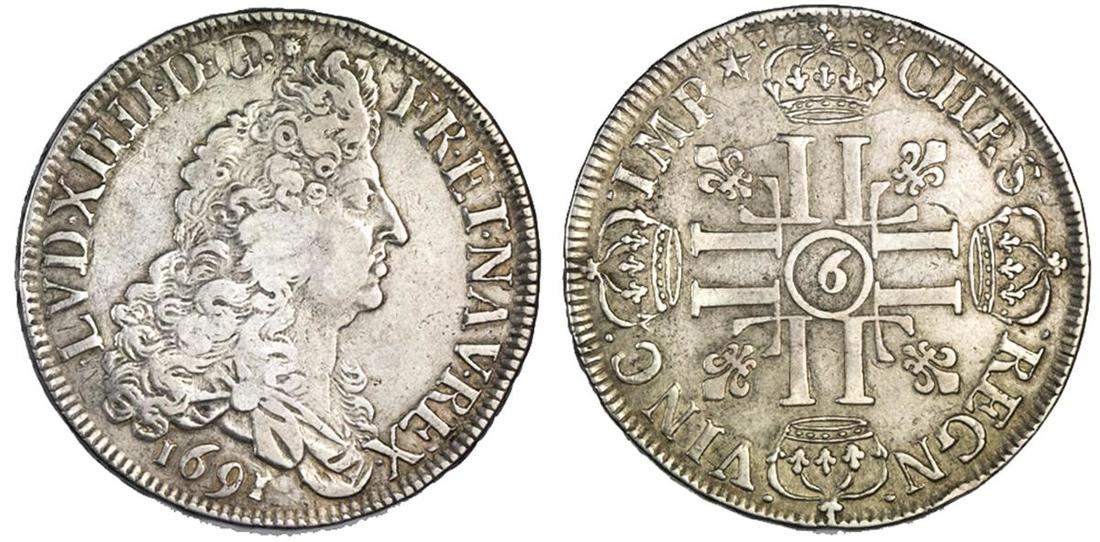 France. Louis XIV (1643-1715). Ecu, 1691 '9'. Rennes. Draped and peruked bust right, rev. Crowned, cruciform double Ls, fleurs in angles, mm at center. Small segments of undertype visible. KM 275.21. Very Fine.
