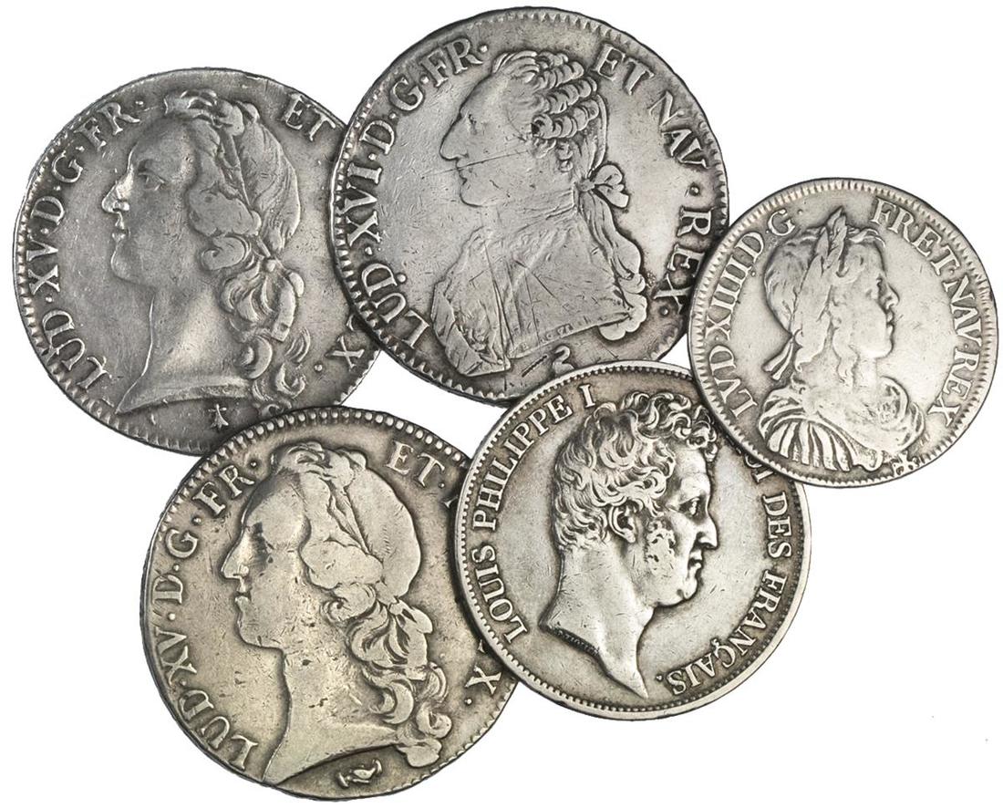 France. Quartet of Crowns: Louis XV (1715-1774). Ecu, 1749 '9'. Rennes; and 1761 K. Bordeaux; Louis XVI (1775-1790). Ecu, 1790 A. Paris. Some obverse scratches; Louis-Philippe (1830-1848). 5 Francs, 1830 A. About Very Fine-Very Fine; also Louis XIV (1643-1715). ½ Ecu, 1649 A. Once wiped. About Very Fine. (5)