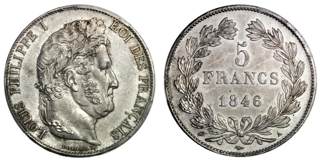 France. Louis-Philippe (1830-1848). 5 Francs, 1846 A. Paris. Laureate head right, rev. Value and date within wreath. KM 749.1. Pleasing light frosty gray. PCGS MS 63.