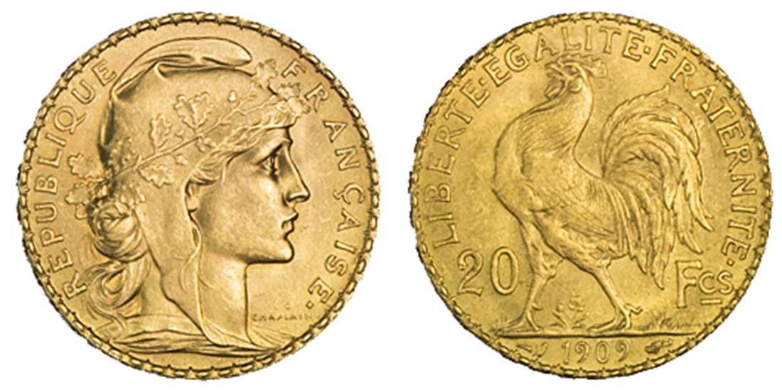 France. Third Republic. 20 Francs, 1909. Wreathed Marianne head right by Chaplain, rev. Rooster. KM 857. Uncirculated.