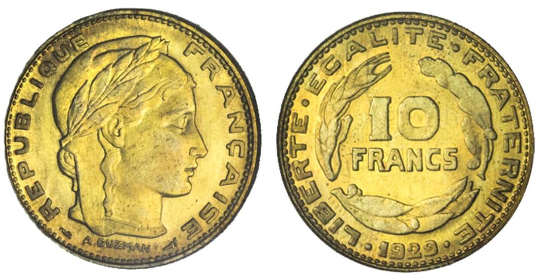 France. Third Republic. Le Concours Monétaire de 1929. Essai 10 Francs, 1929. Aluminum-Bronze. By Guzman. Liberté head right, rev. Thick value within three-part wreath. Mazard 2547a. NGC MS 65.