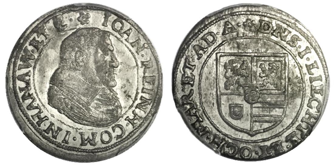 German States. Hanau-Lichtenberg. Johann Reinhard I (1599-1625). Teston (24 Kreuzer), nd (1614-1621). Armored bust right wearing square collar, rev. Shield with quartered Arms, small central shield with Chevron Arms. KM 6. PCGS MS 62.