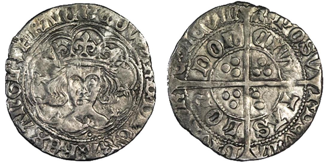 England. House of York. Edward IV or V (1483). Groat, mm halved sun and rose. 2.79 gms. Crowned bust, pellet below facing in tressure; EDWARD, rev. Cross fourchee over two circular legends, trefoils of pellets in inner angles. S.2146. With the ending of the prolific cinquefoil coinage of Edward IV on February 12, 1483, an indenture between the king and the new mintmaster, Bartholomew Reed saw the introduction of the sun and rose mintmark. After the death of Edward IV April 9th 1483, the sun and rose coinage continued, essentially unaltered, through the very brief reign of Edward V and into the beginning of the reign of Richard III, ending with the indenture of July 20, 1483. Very rare. Light gray. About Very Fine. Ex Coin Galleries Sale, Nov. 5, 1997, lot 1906.