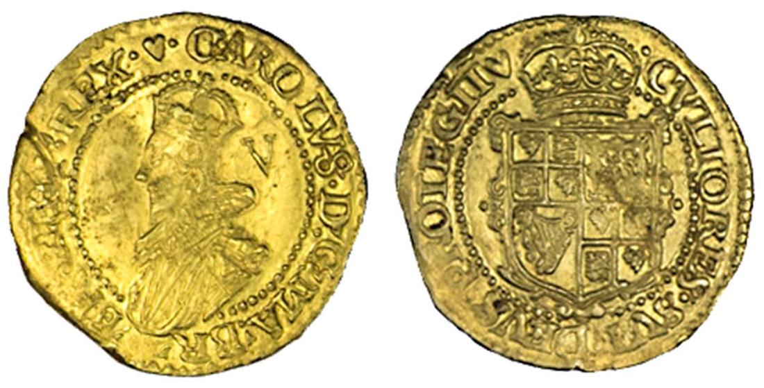 England. House of Stuart. Charles I (1625-1649). Gold Crown, mm heart (1629-30). Tower mint. 2.31 gms. Narrow, elongated crowned bust left, V behind, breaking beaded circle, rev. Crowned, garnished shield breaking beaded circle. S.2712. Test scrape obverse edge and a few test scratches. Extremely Fine.