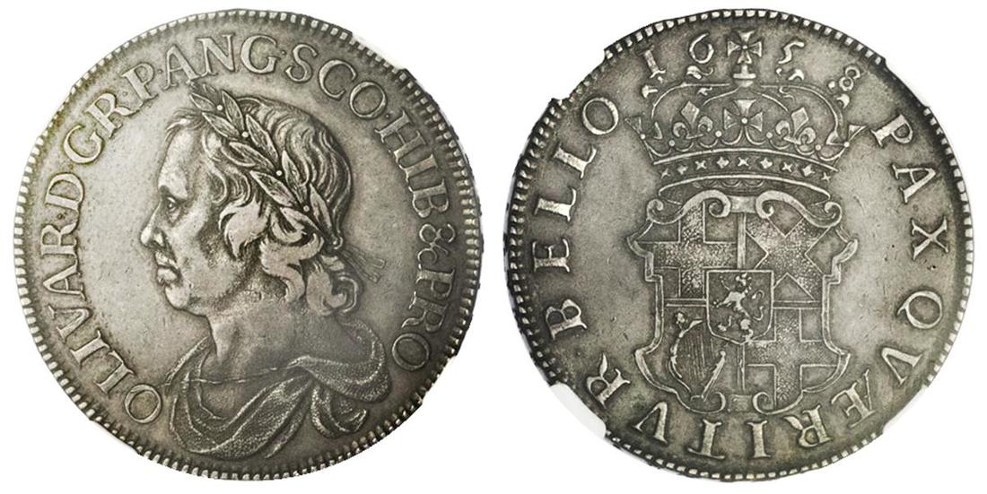 England. Commonwealth. Oliver Cromwell. Crown, 1658/7. Laureate bust of the "Great Emancipator" left by Thomas Simon, rev. Crowned Arms. S.3226, ESC 10, Dav.3773, KM D207. Lovely deep slate gray tone. NGC XF 40.