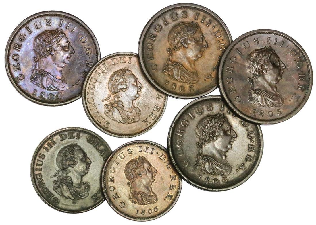Great Britain. George III (1760-1820). Quartet of 1806 Pennies. S.3780, KM 663. Extremely Fine; and Halfpennies, 1799 (2) and 1806. S.3778, 3780; KM 647, 662. Extremely Fine. (7)