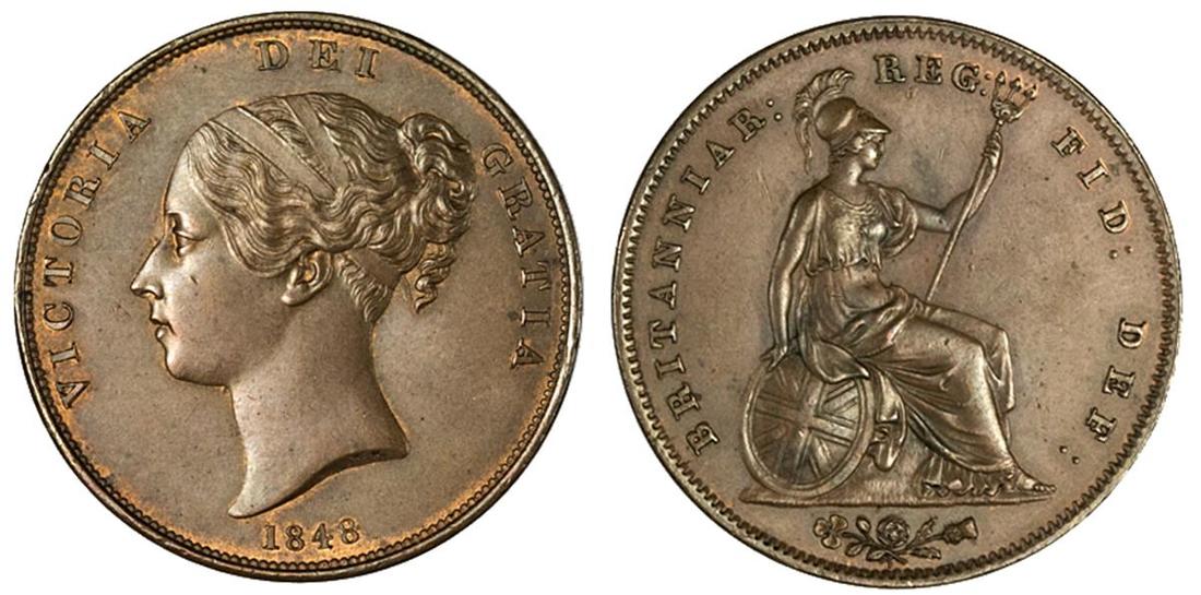 Great Britain. Victoria (1837-1901). Penny, 1848. Young head left, date below, rev. Britannia seated right. S.3948, KM 739. Orange-brown. Choice Uncirculated.