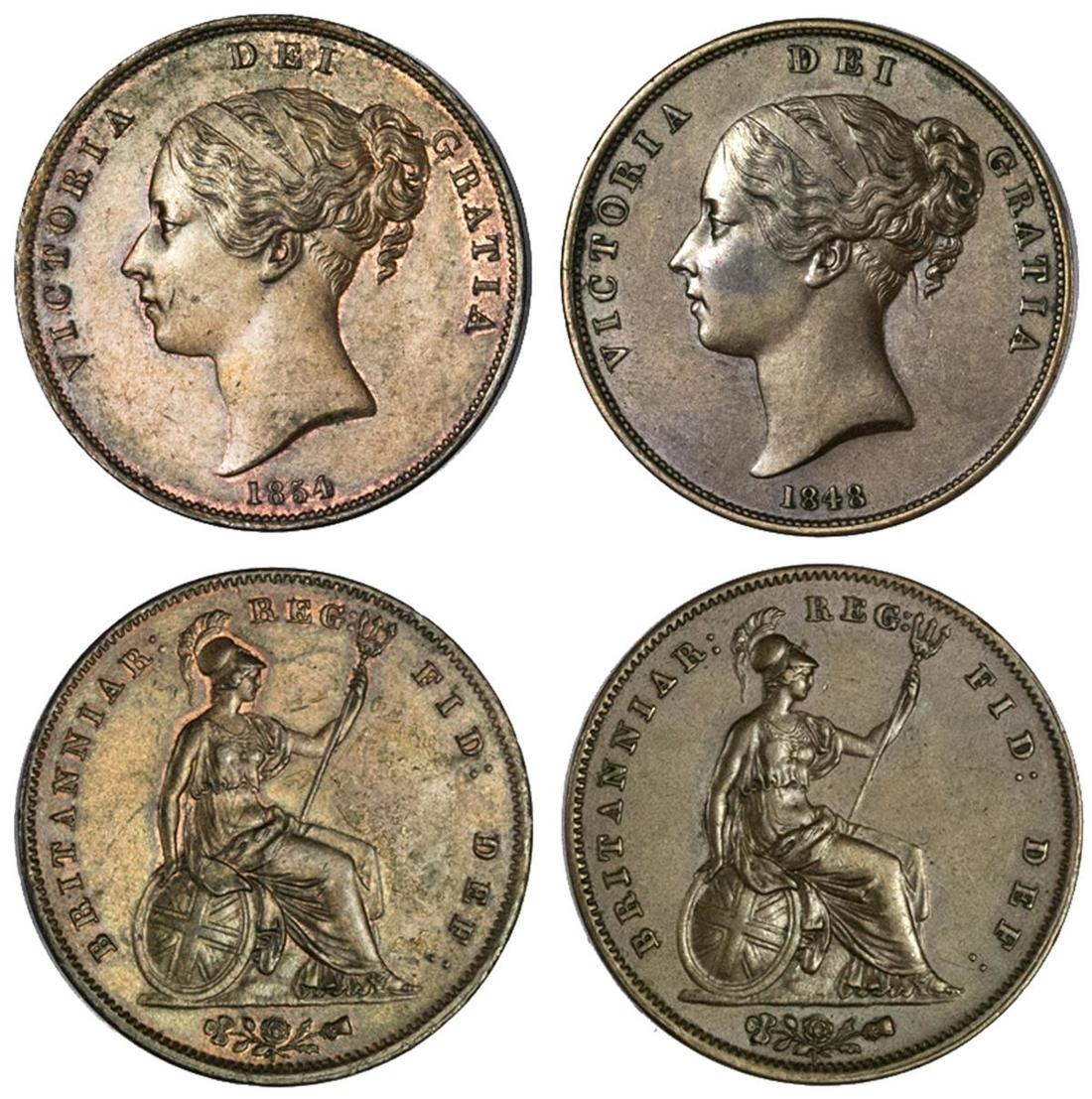 Great Britain. Victoria (1837-1901). Pair of Pennies: 1848 and 1854 Ornamented Trident. Young head left, date below, rev. Britannia seated right. S.3948, KM 739. Choice Extremely Fine-About Uncirculated. (2)