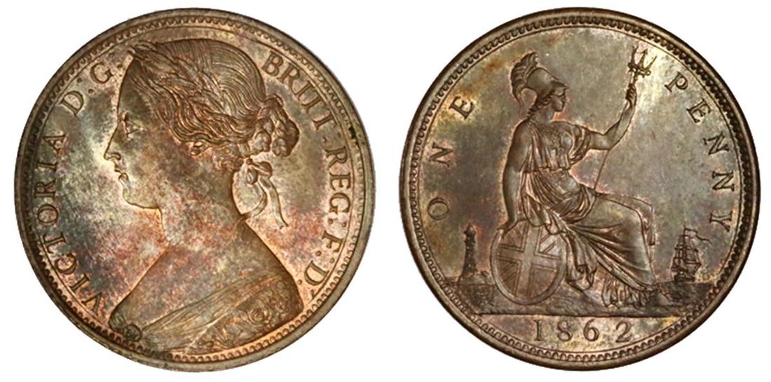 Great Britain. Victoria (1837-1901). Penny, 1862. Without signature on obverse. Laureate, draped bust left, rev. Britannia seated right. S.3954, KM 749.2. Toned a lovely burnt orange-red brown in prooflike fields. Very Choice Brilliant Uncirculated