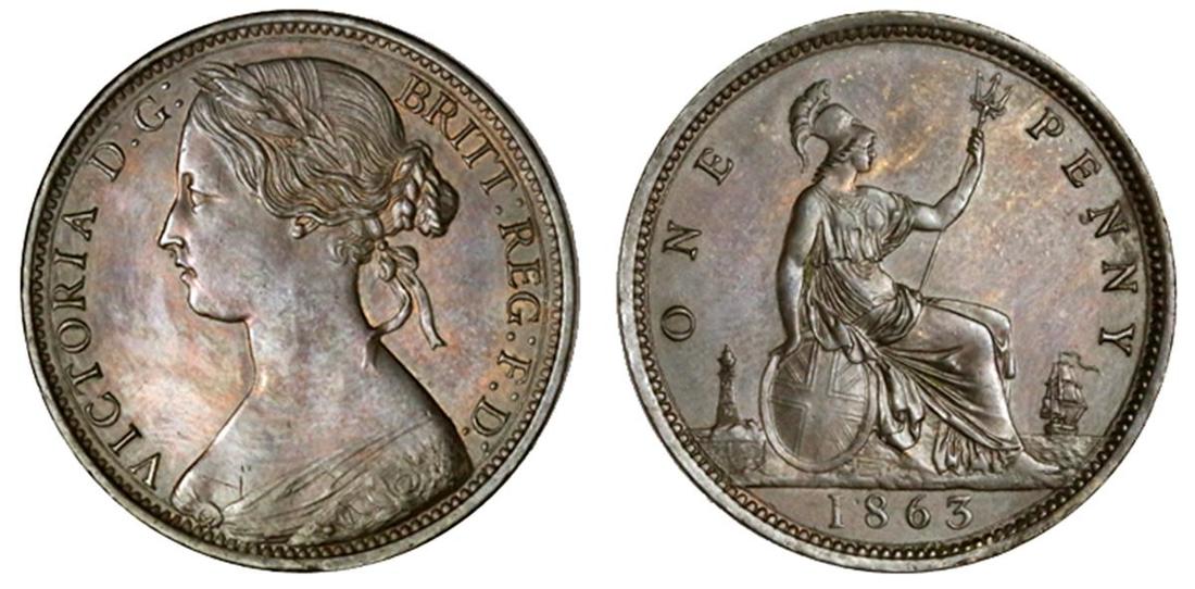 Great Britain. Victoria (1837-1901). Penny, 1863. Laureate, draped bust left, rev. Britannia seated right. S.3954, KM 749.2. Slight smudge. Chestnut brown. Brilliant Uncirculated.
