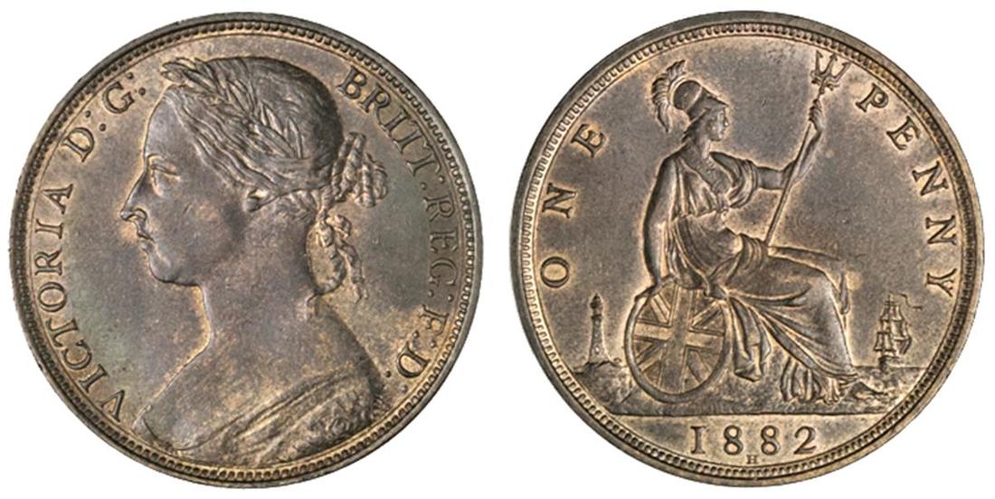 Great Britain. Victoria (1837-1901). Penny, 1882 H. Heaton. Young bust left, rev. Britannia seated right. S.3955, KM 755. Decent lustre, soft cobalt-blue undertone. Uncirculated.