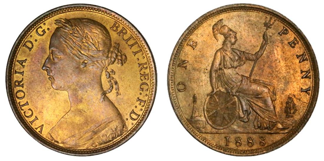Great Britain. Victoria (1837-1901). Penny, 1888. Laureate, mature draped bust left, rev. Britannia seated right. S.3954, KM 755. Orange-red with golden hues. Brilliant Uncirculated.