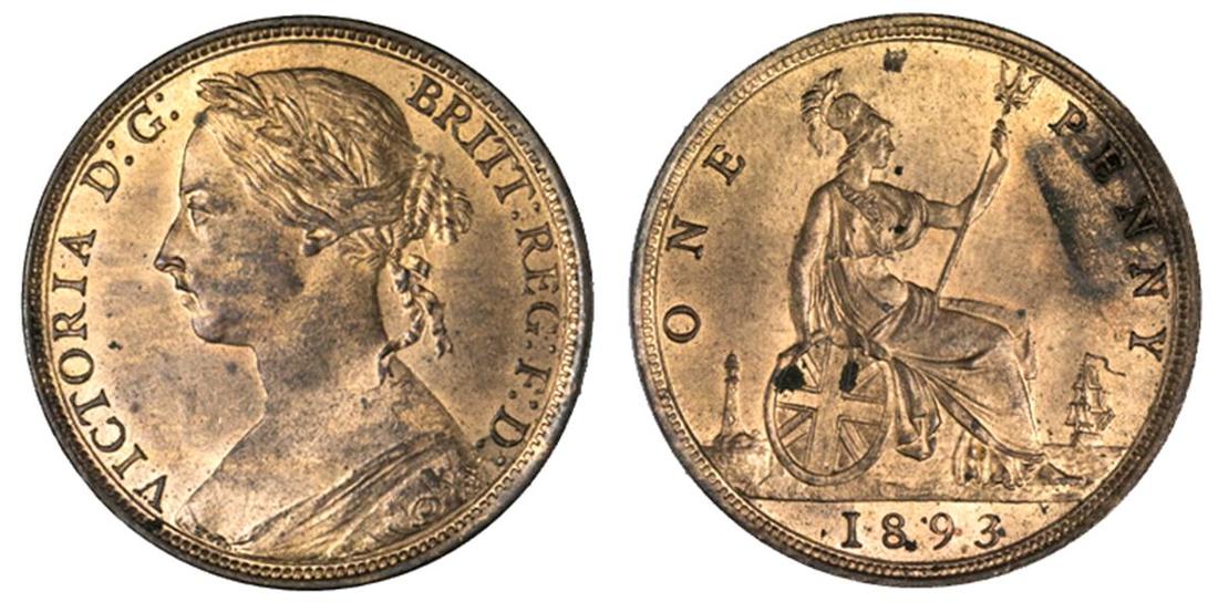 Great Britain. Victoria (1837-1901). Penny, 1893. Young bust left, rev. Britannia seated right. S.3954, KM 755. Carbon spot on reverse. Abundant mint red. Brilliant Uncirculated.